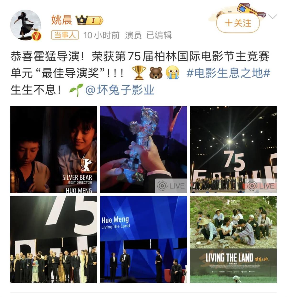 2月23日凌晨,作为影片的幕后功臣,姚晨在个人社交账号发文,用4个感叹号送上祝贺,“恭喜霍猛导演!荣获第75届柏林国际电影节主竞赛单元‘最佳导演奖’!!!《生息之地》生生不息!”