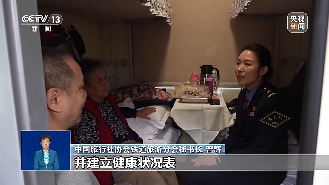 中国旅行社协会铁道旅游分会秘书长 曾辉:我们建议老年游客出行前务必购买专业的商业旅行保险,特别是覆盖一些突发疾病。慢性病患者乘车随时携带病历卡和常用药,并主动向乘务组报备并建立健康状况表,以便获得针对性照护。