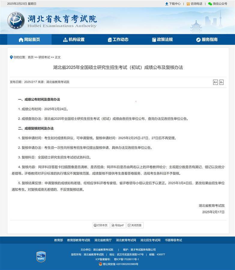 根据湖北省教育考试院统一安排,我校计划于2月24日上午9:00发布2025年全国硕士研究生招生考试(初试)成绩。考生若对本人成绩有异议,可于2月24日至2月27日向我校提出成绩复核申请。