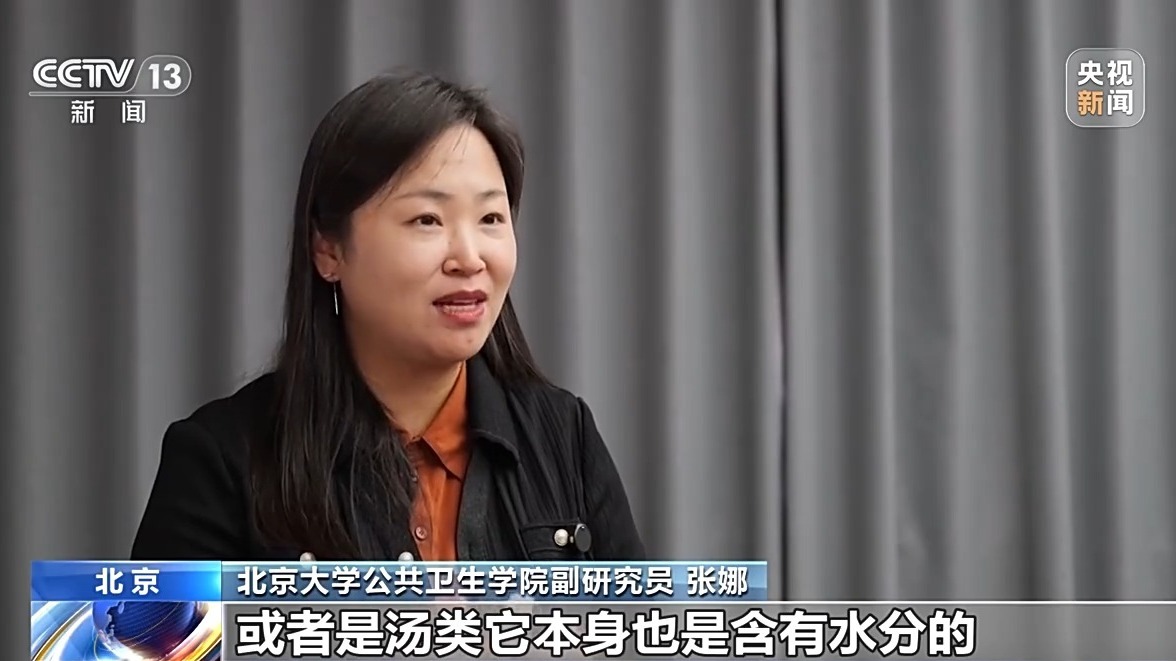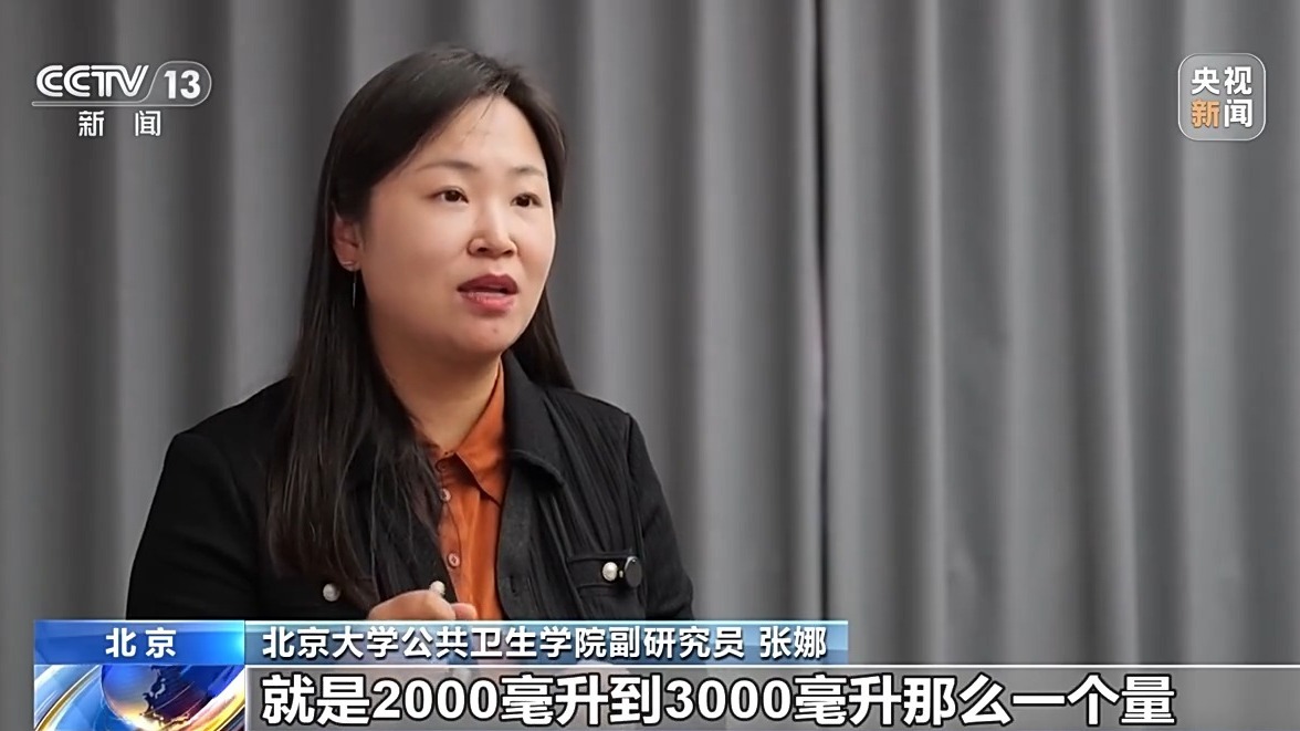 北京大学公共卫生学院副研究员 张娜:从理论上来说,我们每消耗1000卡的能量,需要1~1.5毫升水,比如说我们平常普通的一个成年人,可能日常的能量是2000千卡左右,实际上是相乘,我们平常需要的水分就是2000毫升到3000毫升那么一个量。