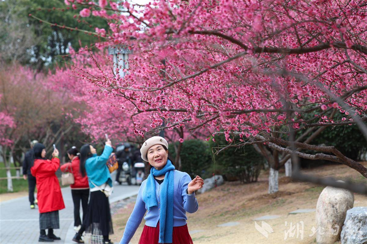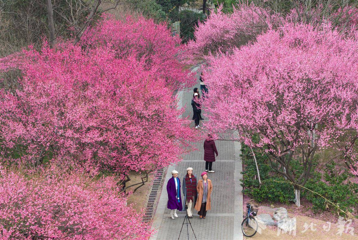 2月24日,襄阳市岘山文化广场梅花绽放,吸引人们前来观赏。