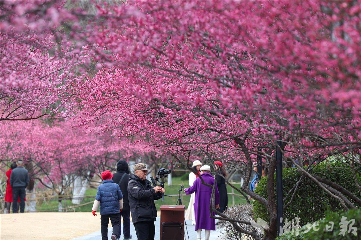 2月24日,襄阳市岘山文化广场梅花绽放,吸引人们前来观赏。近期,襄阳市梅花盛开,各大赏花景点吸引了很多市民游客前来观赏。(视界网 杨东 摄)