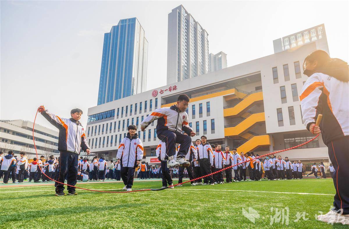 2月24日,武汉市七一华源中学,中学生们在大课间跳绳。
