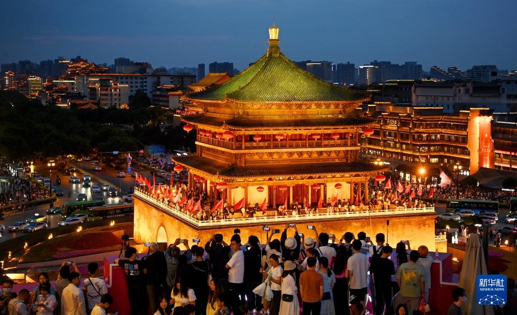 游客在观景平台上观看西安钟楼夜景(2023年5月2日摄)。