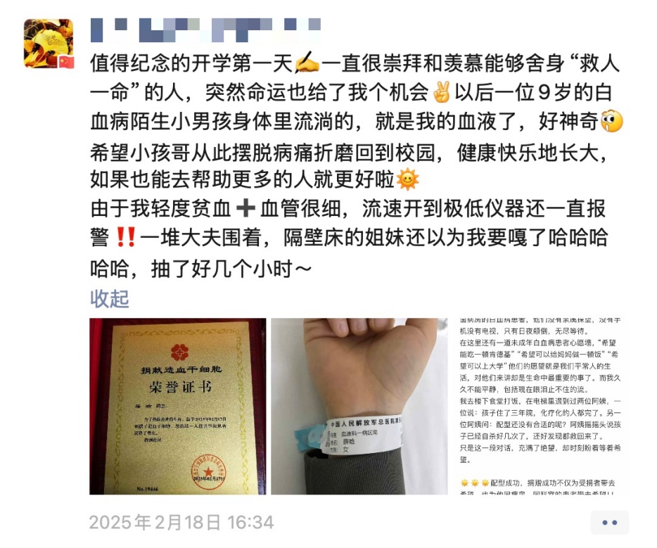 得知自己与一名患血液病的小朋友