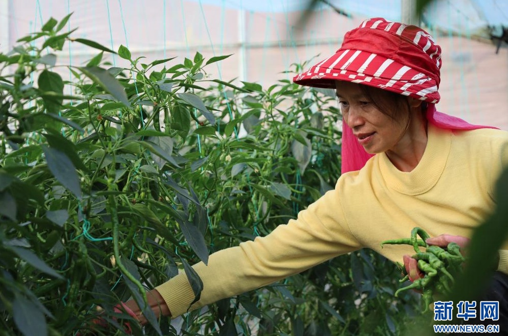 在江西省广昌县头陂镇设施蔬菜基地,当地村民正在采摘辣椒。新华网 王晓震 摄