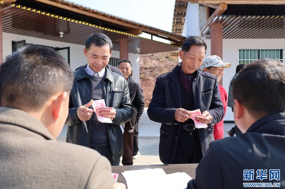 在江西省广昌县甘竹镇朝华村的木耳种植基地,工人们排队领取工资。新华网 王晓震 摄