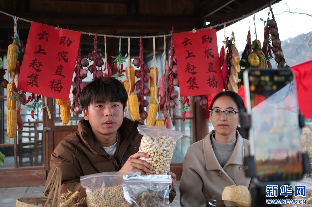 吴聪(左)在江西省抚州市广昌县长桥乡上凡村直播。新华网 王晓震 摄