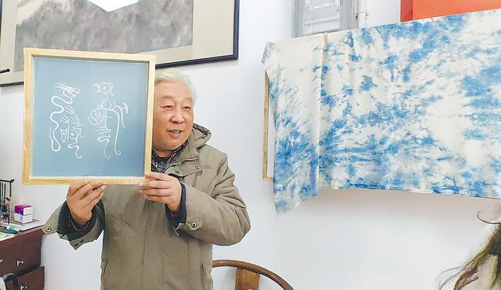 黄荣华在工作室展示用楚文化中鸟虫篆制作的文创,背后是他亲手制作的靛蓝云染作品。