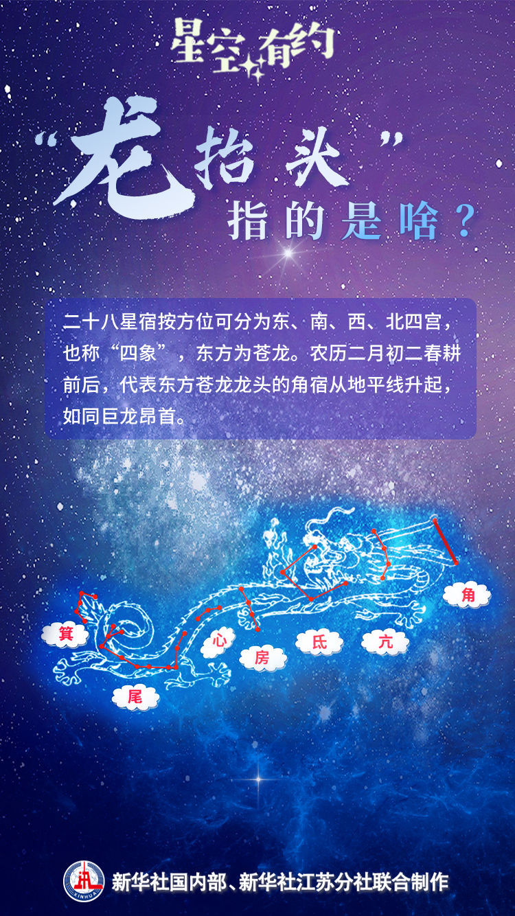 “‘龙抬头’源于我国古人对东方天空中群星形象的浪漫想象。”中国科学院紫金山天文台科普主管王科超介绍,我国古代将天球赤道和黄道附近的恒星划分为二十八宿,按方位可分为东、南、西、北四宫,也称“四象”,分别是东方苍龙、南方朱雀、西方白虎、北方玄武。“龙抬头”天象中的龙,指的就是东方苍龙。
