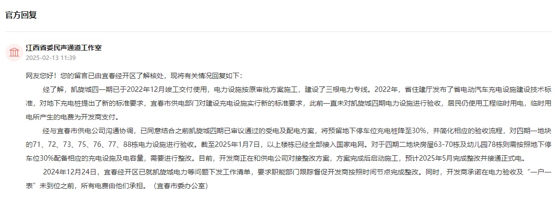 2024年12月24日,宜春经开区已就凯旋城电力等问题下发工作清单,要求职能部门跟踪督促开发商按照时间节点完成整改。同时,开发商承诺在电力验收及“一户一表”未到位之前,所有电费由他们承担。