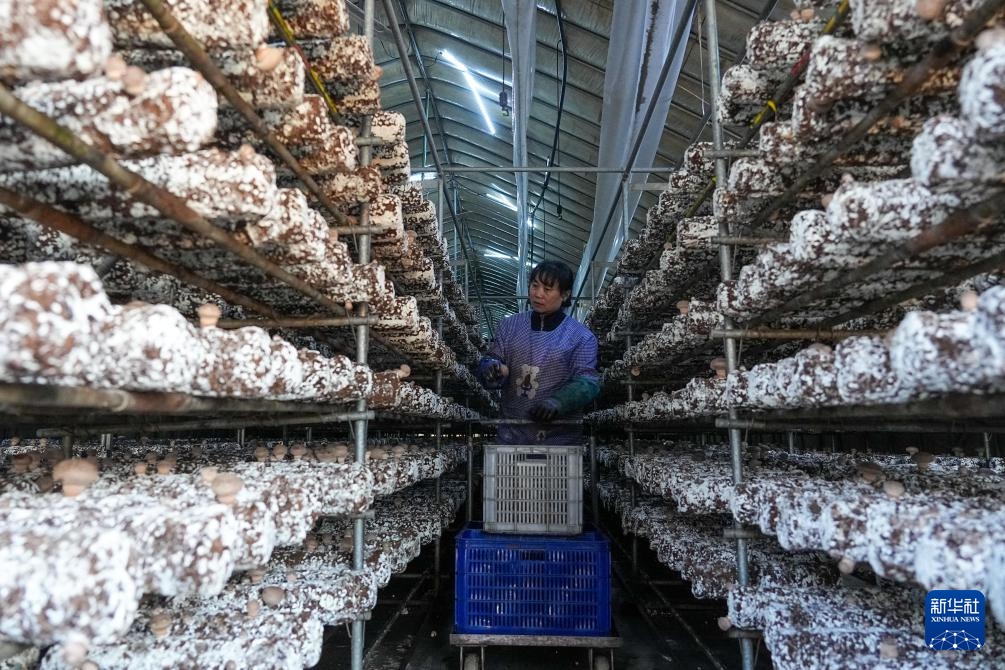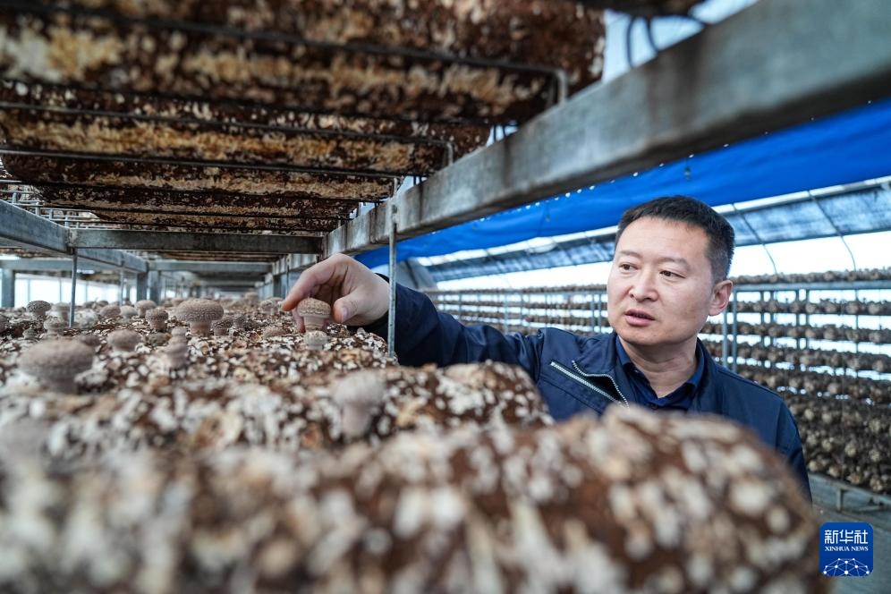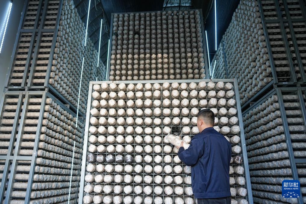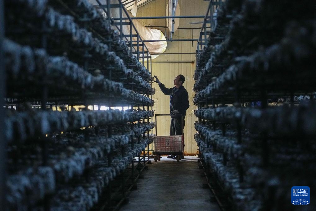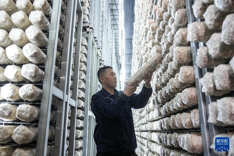 2月27日,山东七河生物科技股份有限公司员工在智慧厂房内查看香菇生长状况。