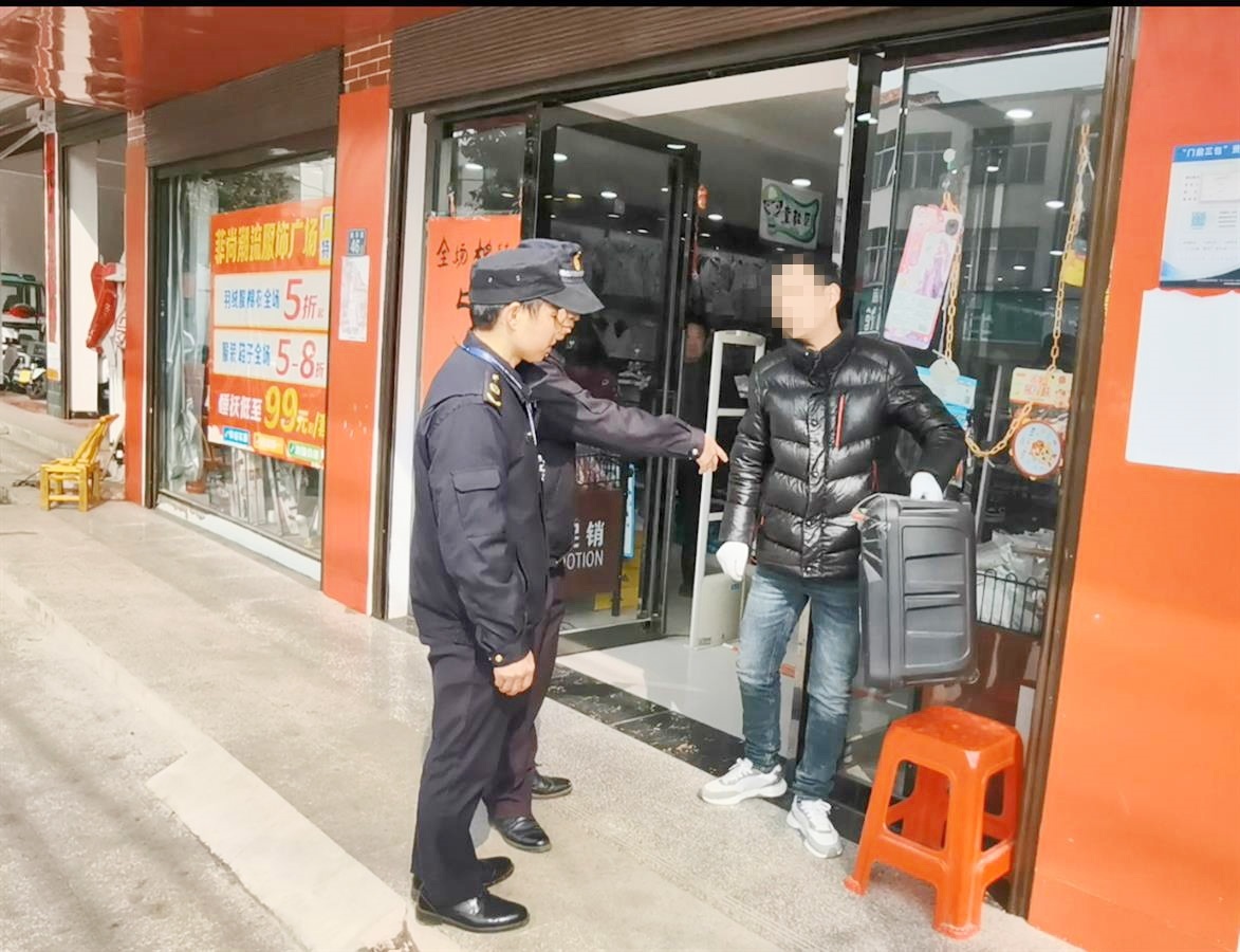 高音喇叭促销,执法队员劝导店老板整改。摄影:楚天都市报极目新闻记者卢成汉