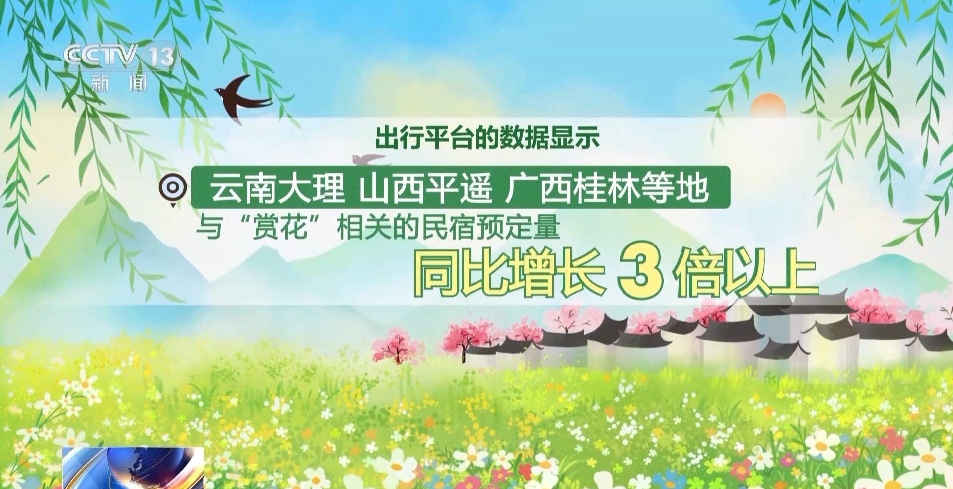 出行平台的数据显示,云南大理、山西平遥、广西桂林等地与“赏花”相关的民宿预订量同比增长3倍以上。