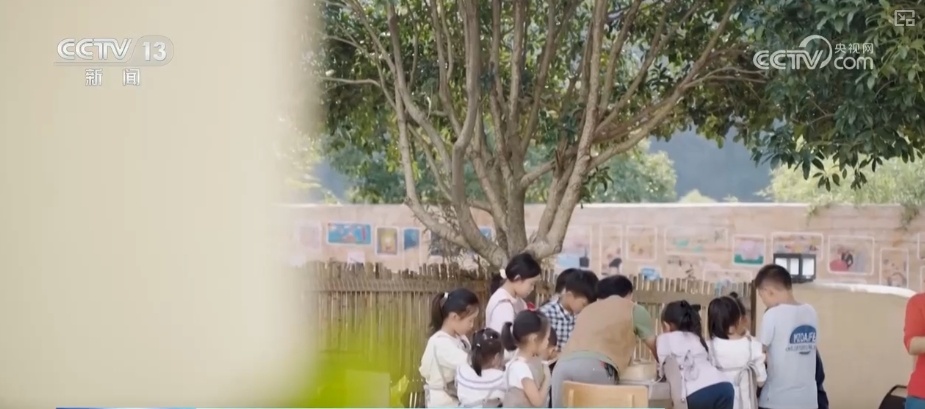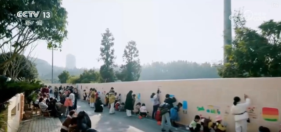 万物复苏的春天里,湖南郴州塔水村村口,一堵长约100米的手绘墙前,一些从城里来的孩子们正在专注涂鸦。