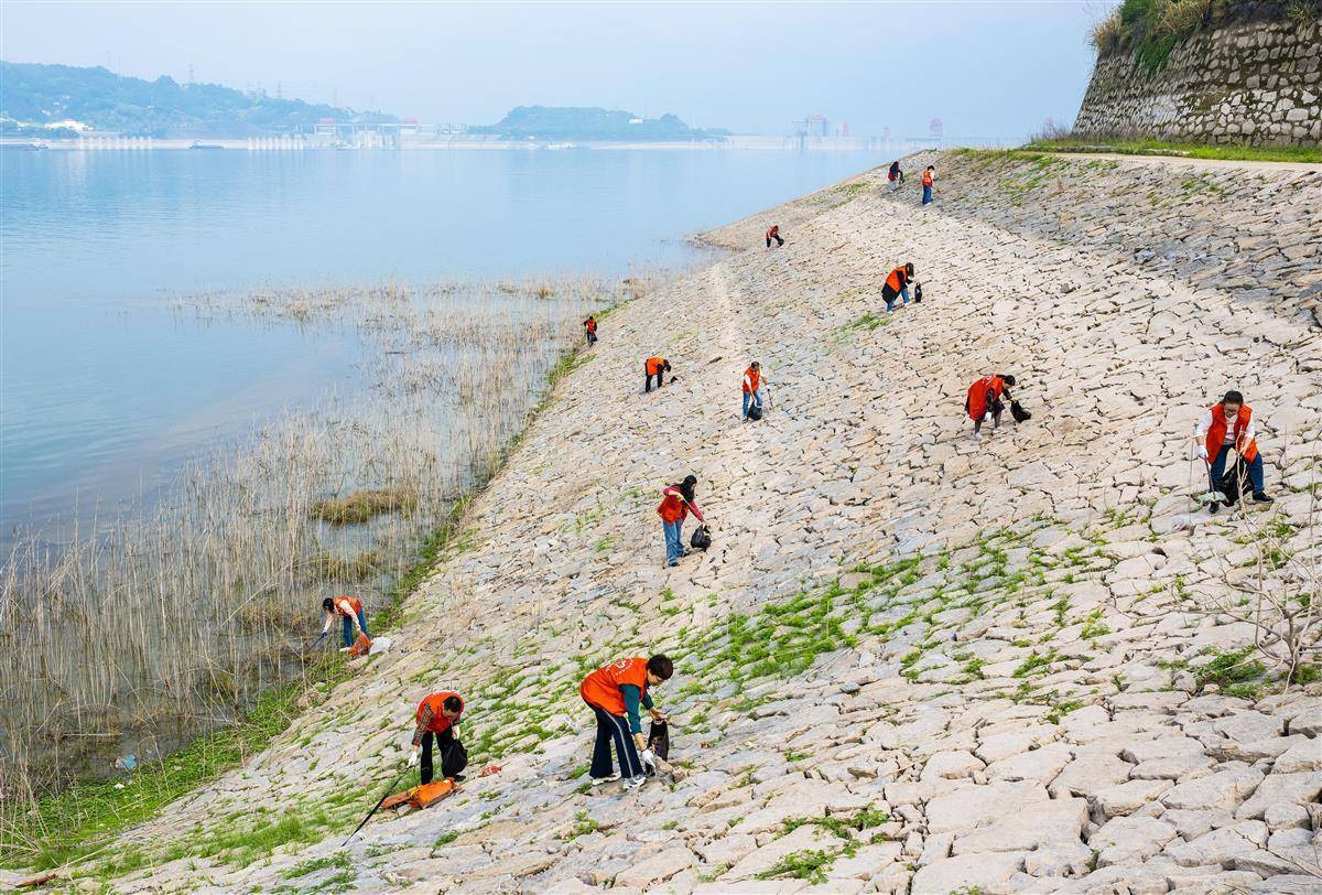 秭归县志愿者在三峡大坝上游库岸消落带上巡库巡察,清理沿线垃圾和杂物。(视界网 郑家裕 摄)