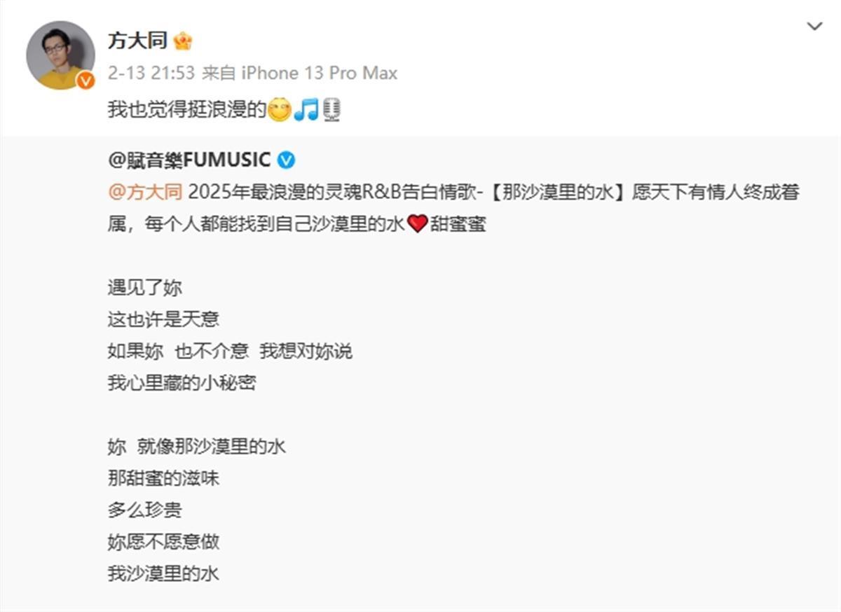 记者注意到,在2月13日,方大同的个人账号仍在更新。