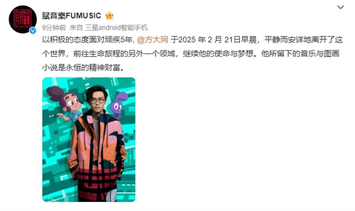 配文写道:以积极的态度面对顽疾5年,方大同于2025年2月21日早晨,平静而安详地离开了这个世界,前往生命旅程的另外一个领域,继续他的使命与梦想。他所留下的音乐与图画小说是永恒的精神财富。