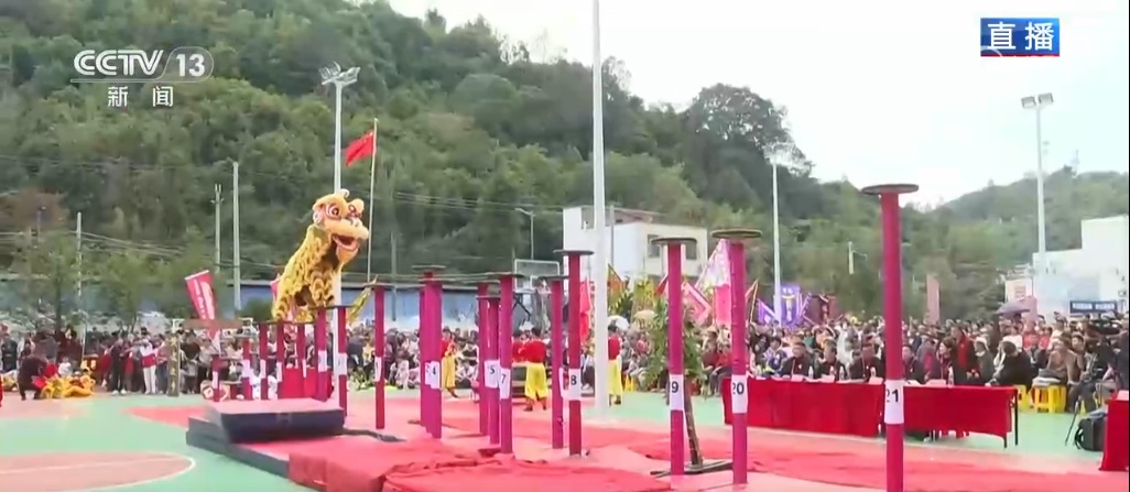 记者身后正在举行一场精彩的醒狮高桩比赛,9支参赛队伍来自粤港澳大湾区不同城市,其中有三支来自香港和澳门的醒狮队伍是第一次来这里参加“二月二”的活动。现在正在进行表演的就是来自香港的醒狮队伍,通过镜头大家能够看到队员们脚下的高桩总共有21根,最高的有2.5米,最矮的也有1.2米,从高到低依次排序像一座连绵的山峰。醒狮队员们配合着鼓点,在高桩上跳跃、舞动,就像狮子在悬崖峭壁上攀爬、寻觅,最终登上高峰,找到了食物,这个过程就叫采青。醒狮高桩是南狮特有的竞技项目,代表着南狮的最高水平,记者在现场看到这场比赛吸引了当地及周边地区的不少居民前来观赛。比赛将持续到下午5点多,届时也会揭晓获奖队伍。
