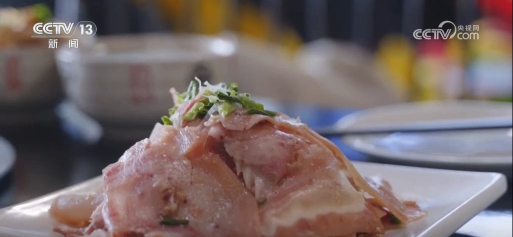 在长子县,猪头肉的制作并不复杂,简单的卤料调制清汤,将猪头浸入小火慢煮,等到去腻入味又不失弹性,捞出晾凉,切成片状,淋上蒜泥香醋,撒上葱丝搅拌,这道清凉爽口的美味就能上桌了。但这道菜要做好可不容易,您瞧,这位片肉的师傅,手腕稳如磐石,刀锋斜切入肉,片出的肉薄如蝉翼,吃到嘴里脆软醇香、肥而不腻,这个口感,没点真功夫还真搞不定。如今,长子猪头肉早已成为当地的一张美食名片,它寄托着人们一年的祝福和期盼,也承载着对家乡的记忆和情感。