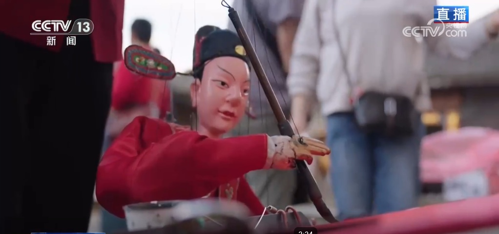 在这样热闹的日子怎能少得了当地非遗的表演呢?在和贵楼的院子里,南靖县非遗展演中心的演员们带来的非遗木偶戏。记者身旁的这位大哥正在用提线木偶写字,他是用手操控着十几根线牵引木偶来完成动作,难度很高。在古代,其实也有着在“二月二”行开笔礼的说法,镜头里提线木偶展示了写字的技艺,希望大家都能抬头迎喜,举步纳福。在提线木偶一旁是布袋木偶戏,这是漳州的一项国家级非物质文化遗产,不仅是有精致的人偶造型,还有缩小版的舞狮造型,它们在演员们的巧手中可以说是活灵活现、栩栩如生。
