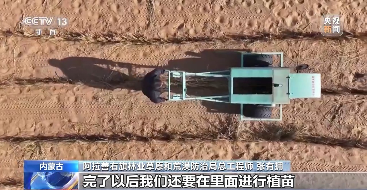 阿拉善右旗林业草原和荒漠防治局总工程师 张有拥:采用1米乘1米的草方格,主要它是用稻草铺设草方格,完了以后我们还要在里面进行植苗,最主要采取的就是用梭梭进行生物固沙。