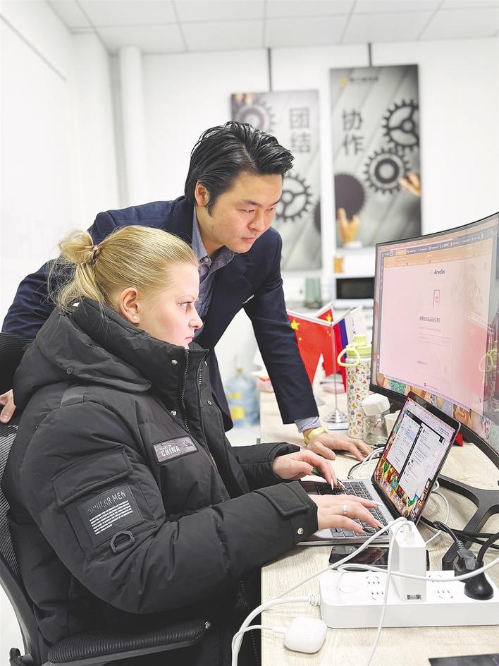 徐志成与俄罗斯籍妻子安娜对接处理线上业务。 (湖北日报通讯员 梁欣 摄)