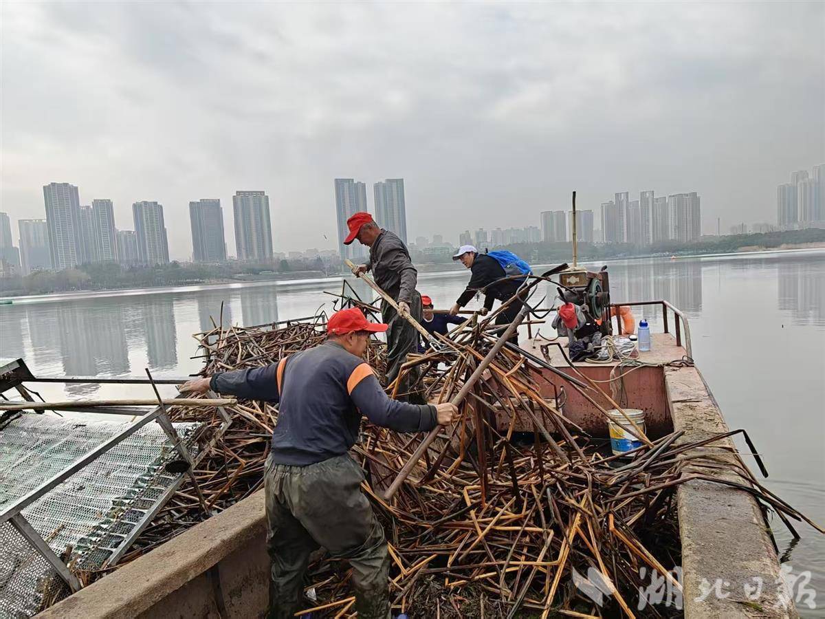 月湖位于琴台,曾有“武汉市最美客厅”的美誉。该湖属于封闭型的静态水体,平均水深不足1米,水底富集淤泥。如果不及时清除往年残留的荷梗,随着气温渐升,这些荷梗及其他枯死水生植物茎秆容易腐烂,给水体带来更多污染,加剧水体富营养化的风险。