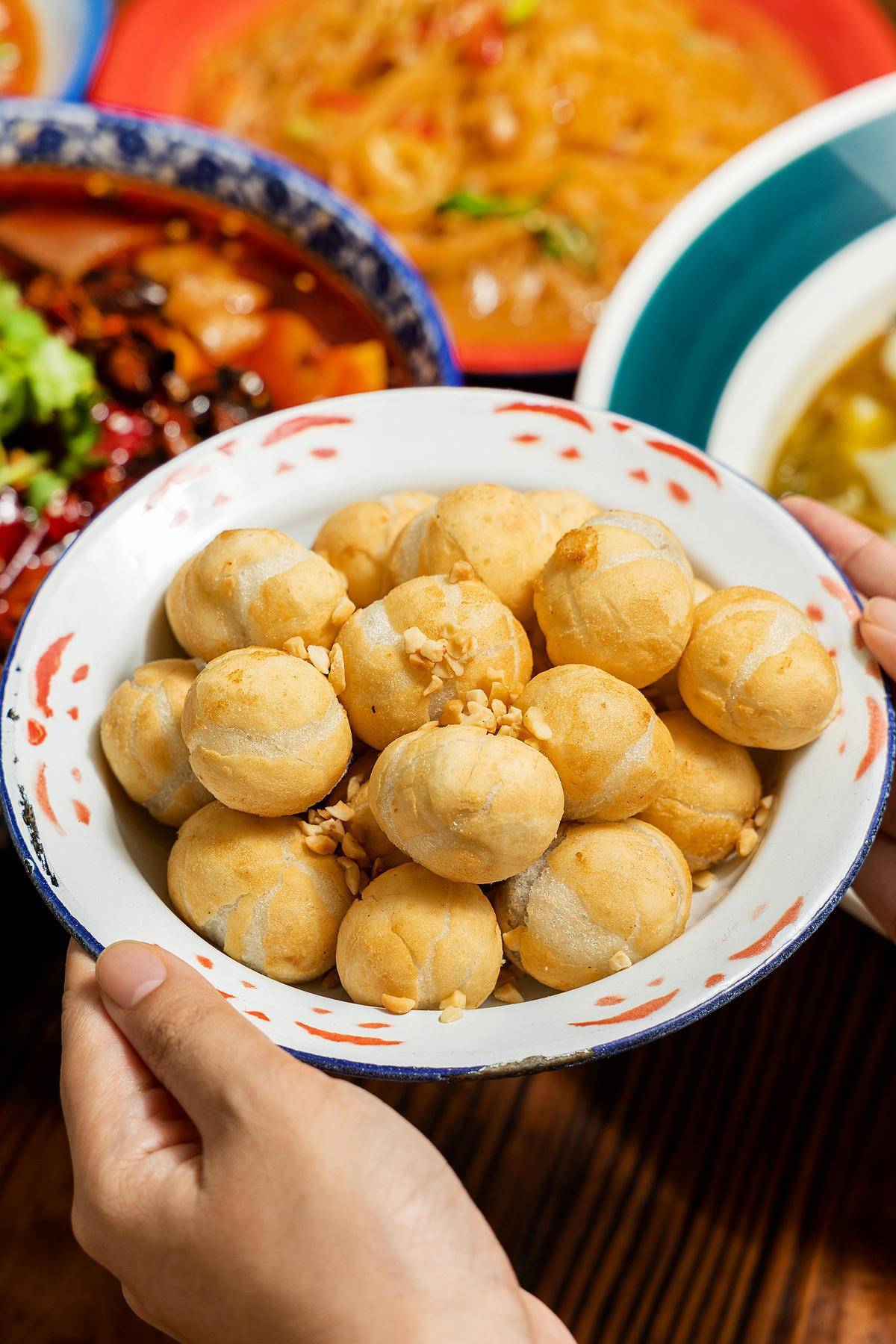 外省罕见的咸口汤圆,将糯米汤圆煮至半熟,与蒜苗、腊肉丁同炒,外层焦脆内里流心,苏轼谪居黄州时创制,现为鄂东地区立春后的特色早点。