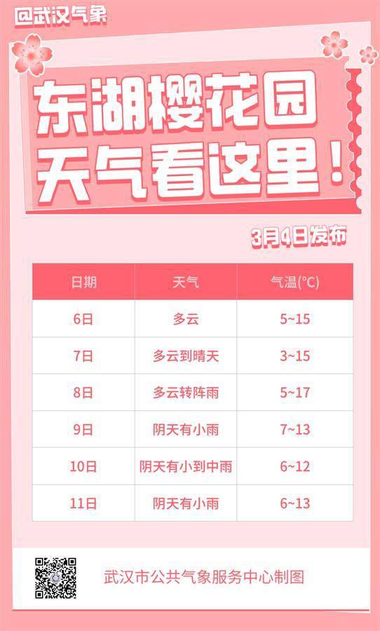 湖北日报讯(记者汤炜玮、通讯员陈声超)3月4日从武汉市气象局获悉,根据最新天气预报分析,今天白天武汉市阴天到多云,南部有短时小雨;明天以多云天气为主,气温回升;此外8日夜间-11日有降水过程发生。