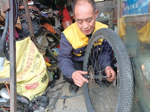 2月27日,记者踏入这家小店,何中朝正专注地修理一辆变速自行车。