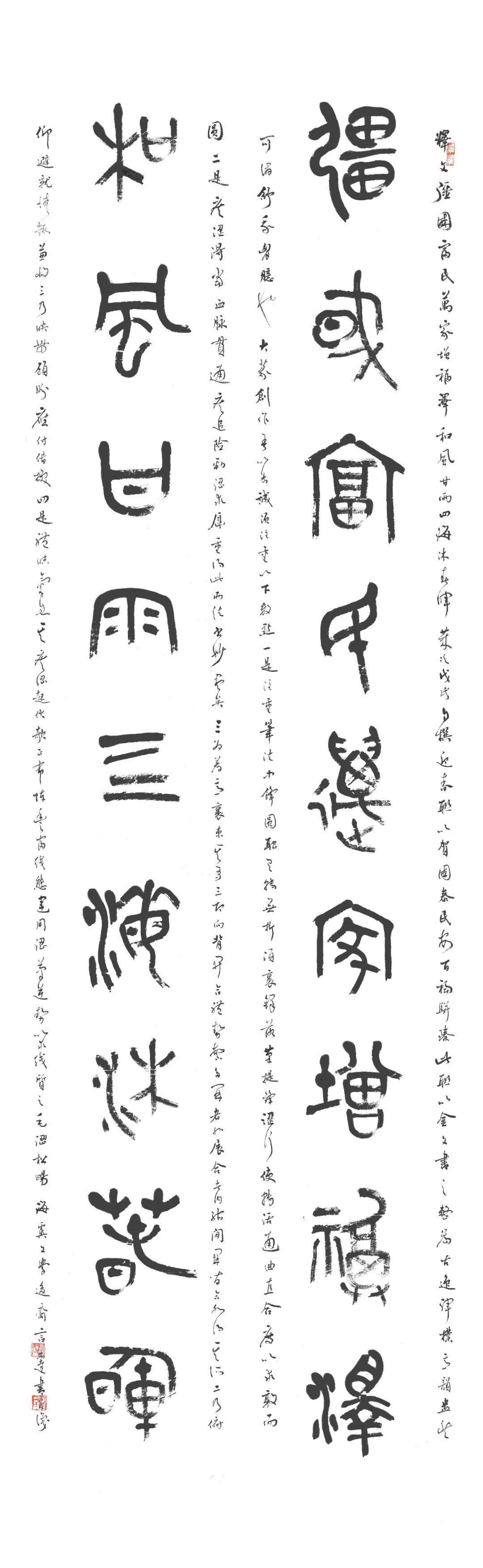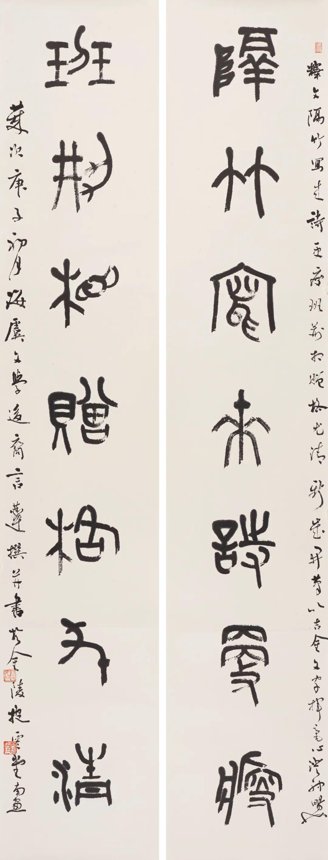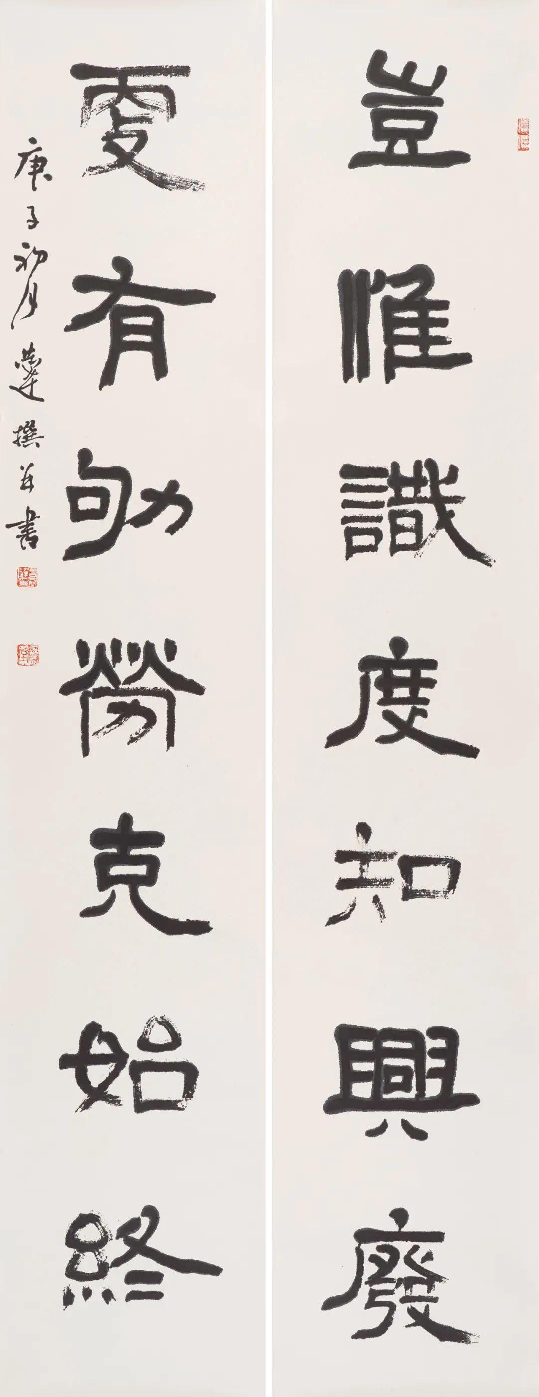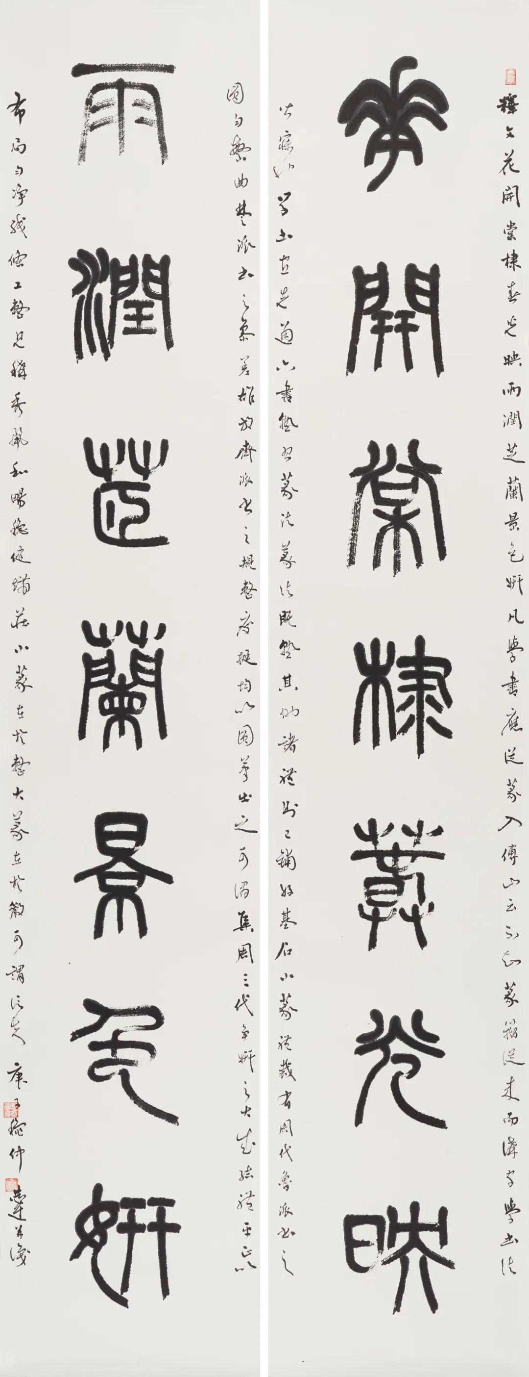 第二个特点是笔法纯熟,法我两忘。在空间和时间上,随着笔走龙蛇,心中波澜与笔下旋律不断翻滚变化。空间上则合理布白,计白当黑,点画起伏,使转互生。展览中《强国和风》楹联以金文书之,整篇古逸浑朴,意蕴盎然。作者在该联边款中陈述“大篆创作,须注重一是笔法中锋圆融,有转无折,裹锋落笔,提锋涩行,使转活通,曲直合度,以求敦而圆。二是疾涩得当,血脉贯通,疾追险劲,涩求厚重,得此两法,书妙尽矣。三为着意裹束,其有三,即向背开合,体势繁多,开者外展,合者内缩,间开间合,永得其所。二乃俯仰避就,情趣兼收。三乃映带顾盼,应付借换。四是体味气息,其疾涩起伏,欹正布阵,丰富线态,运用涩笔逆势,以求线质之毛涩松畅。”另观其小篆自作联:“花开棠棣春光映,雨润芝兰景色妍。”其边款注云:“凡学书应从篆入,傅山云,不知篆籀从来,而讲字学书法皆寐也。学书宜先通六书,熟悉篆法,篆法既熟,其他诸体则已铺好基石。小篆体裁有周代派,书之圆匀繁曲。楚派书之参差雄放,齐派书之规整瘦挺,均以圆笔出之,可谓集周三代争妍之大成。结体平正,以布局匀净、线条工整见称,秀丽、和畅、稳健、端庄。小篆在于整,大篆在于散,可谓信夫。”同样是写楚篆,他的自作联:“胸中学博图书富,腕底书生笔墨鲜。”其注识云:“此乃楚简文字也。东汉许慎《说文》叙云,战国时期为言语异声、文字异形。其时,东方六国文字,虽均是殷周文字演化而来,却变异多端,常有匪夷所思之处。楚文字在六国文字之中,迄今发现最多,楚简帛大量出土,被认为是最大的考古发现之一,在学术上有着广泛而深远之影响。”因而他写楚篆“腕下古意勃勃”,因其笔法指向不同,追求的境界自不一样,而呈现的自是另一番境界与效果。