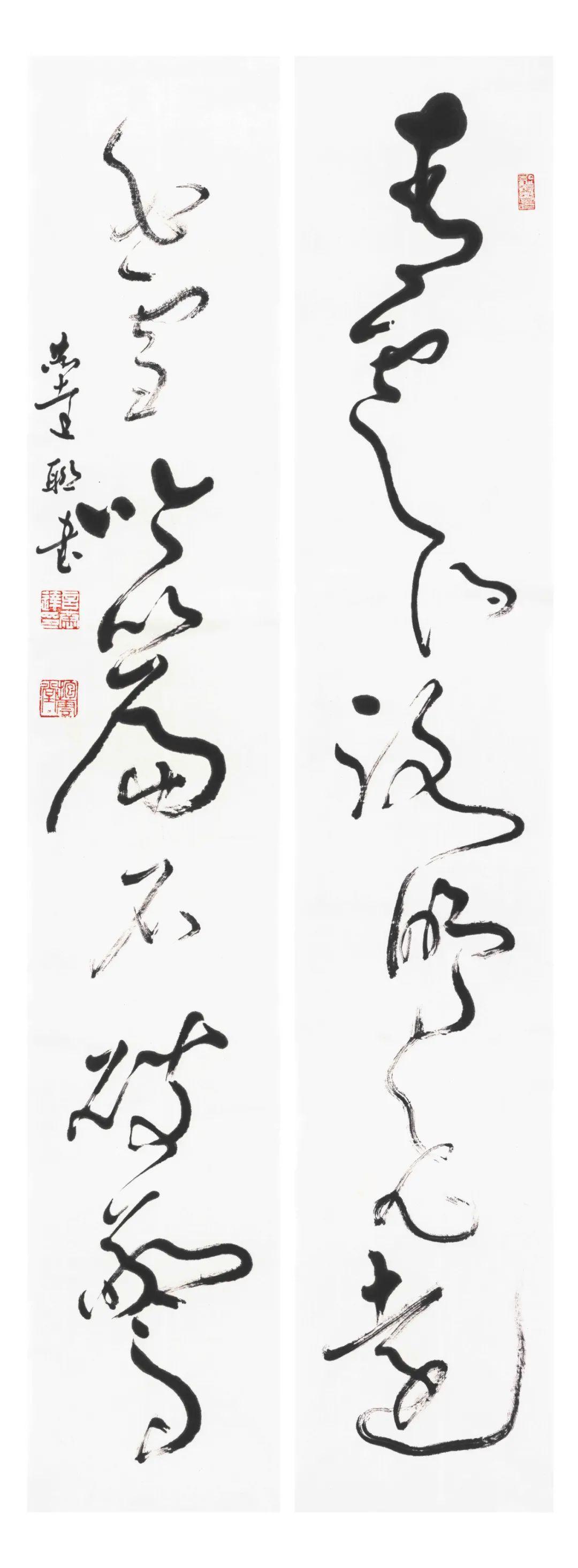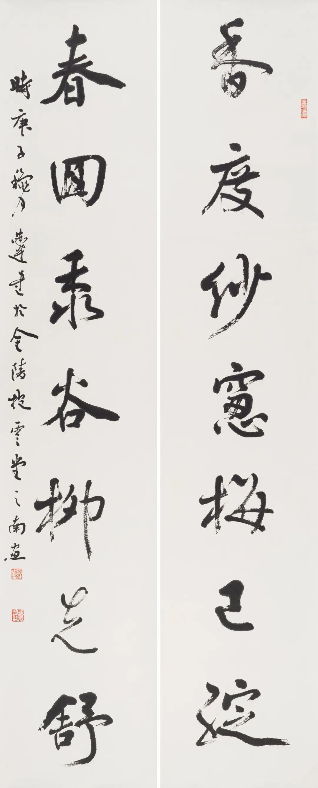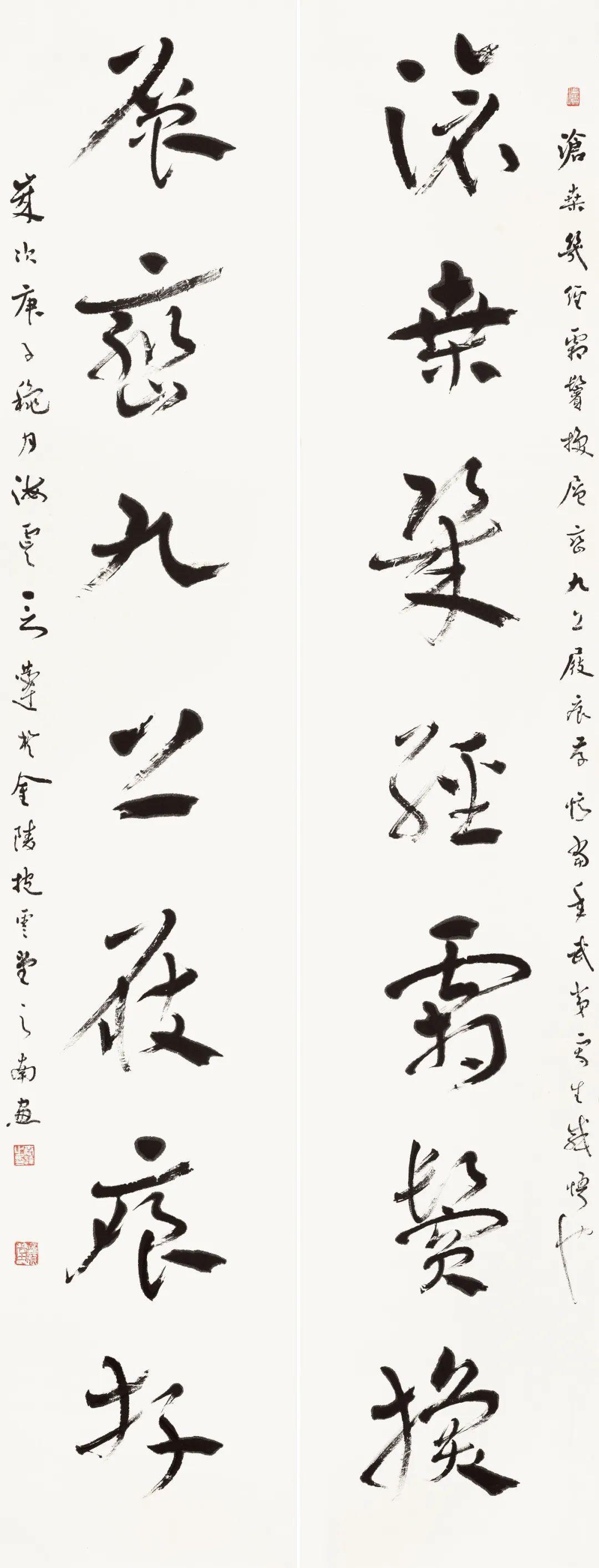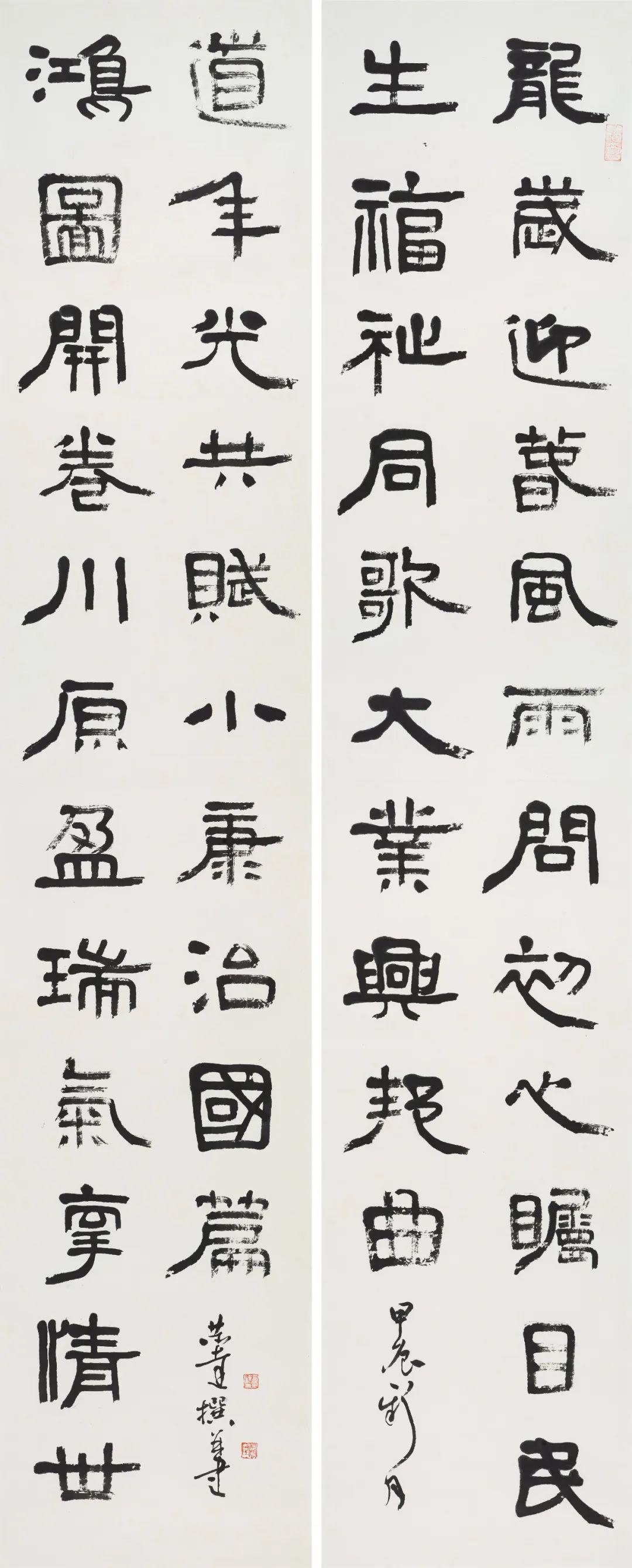 第二个特点是笔法纯熟,法我两忘。在空间和时间上,随着笔走龙蛇,心中波澜与笔下旋律不断翻滚变化。空间上则合理布白,计白当黑,点画起伏,使转互生。展览中《强国和风》楹联以金文书之,整篇古逸浑朴,意蕴盎然。作者在该联边款中陈述“大篆创作,须注重一是笔法中锋圆融,有转无折,裹锋落笔,提锋涩行,使转活通,曲直合度,以求敦而圆。二是疾涩得当,血脉贯通,疾追险劲,涩求厚重,得此两法,书妙尽矣。三为着意裹束,其有三,即向背开合,体势繁多,开者外展,合者内缩,间开间合,永得其所。二乃俯仰避就,情趣兼收。三乃映带顾盼,应付借换。四是体味气息,其疾涩起伏,欹正布阵,丰富线态,运用涩笔逆势,以求线质之毛涩松畅。”另观其小篆自作联:“花开棠棣春光映,雨润芝兰景色妍。”其边款注云:“凡学书应从篆入,傅山云,不知篆籀从来,而讲字学书法皆寐也。学书宜先通六书,熟悉篆法,篆法既熟,其他诸体则已铺好基石。小篆体裁有周代派,书之圆匀繁曲。楚派书之参差雄放,齐派书之规整瘦挺,均以圆笔出之,可谓集周三代争妍之大成。结体平正,以布局匀净、线条工整见称,秀丽、和畅、稳健、端庄。小篆在于整,大篆在于散,可谓信夫。”同样是写楚篆,他的自作联:“胸中学博图书富,腕底书生笔墨鲜。”其注识云:“此乃楚简文字也。东汉许慎《说文》叙云,战国时期为言语异声、文字异形。其时,东方六国文字,虽均是殷周文字演化而来,却变异多端,常有匪夷所思之处。楚文字在六国文字之中,迄今发现最多,楚简帛大量出土,被认为是最大的考古发现之一,在学术上有着广泛而深远之影响。”因而他写楚篆“腕下古意勃勃”,因其笔法指向不同,追求的境界自不一样,而呈现的自是另一番境界与效果。