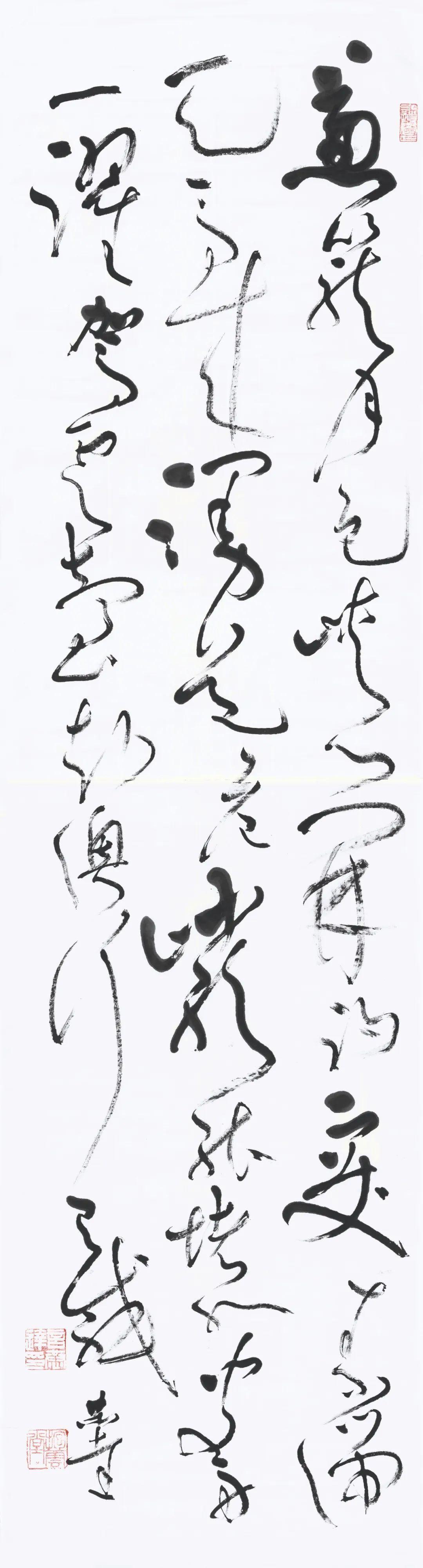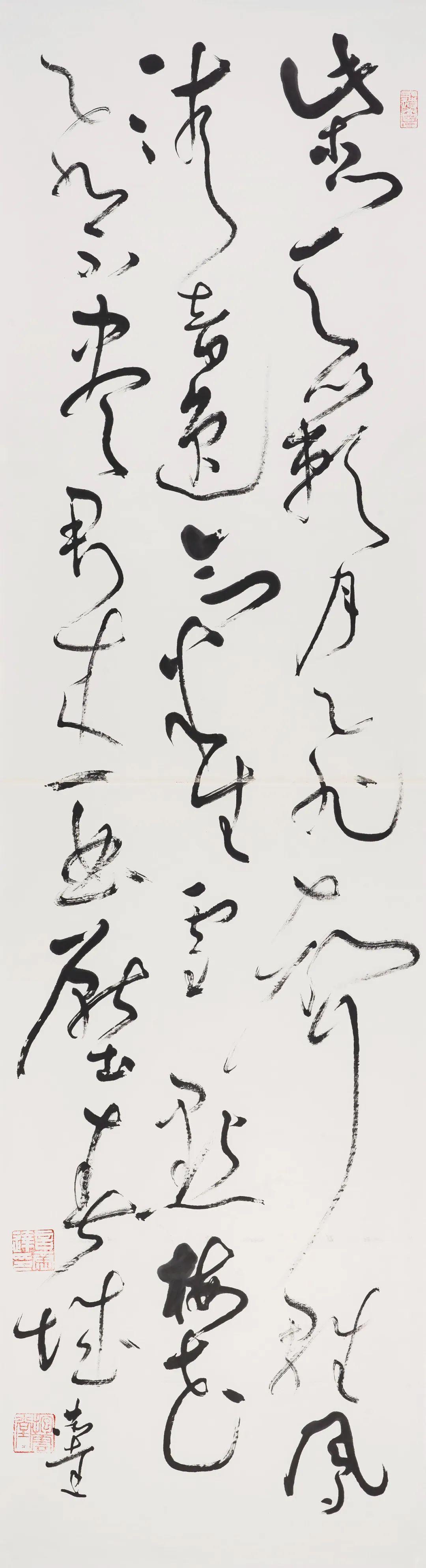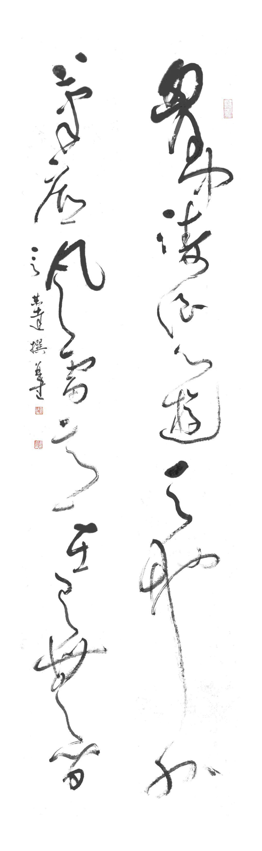 第三个特点是五色相润,真淳方见。古人云墨分五彩,即浓、淡、润、渴、白。言恭达书写之时不再强调字形的边界外露,主要是由墨色的浸润与层次的效果来体现书法文字所蕴藏的深沉和质量,体现出了书法的书卷气与韵味。他说用墨关键在用水,他采取他的水墨画法中先蘸墨后蘸水的方式,形成墨破水、水破墨的肌理效果。由于积累了长时间用墨的经验,再加上他画山水的用墨经验。所以,他的书法用墨浓淡相宜,燥润相适,五彩焕然,达到了出神入化,淋漓畅快的效果。他的大草自作诗四联屏:“梅枝绽素漫天皑,万种风情任剪裁,寥阒润滋求磊落,此中真意醉花开。”开篇的“梅枝绽”线段所形成的墨块,与“醉花开”三字所形成的墨块遥相呼应,“此中”的“中”,“剪裁”的“裁”,“花开”的“开”的渴墨长线形成的虚灵的板块构成了全篇虚实相生,奇妙的笔墨理想效果。