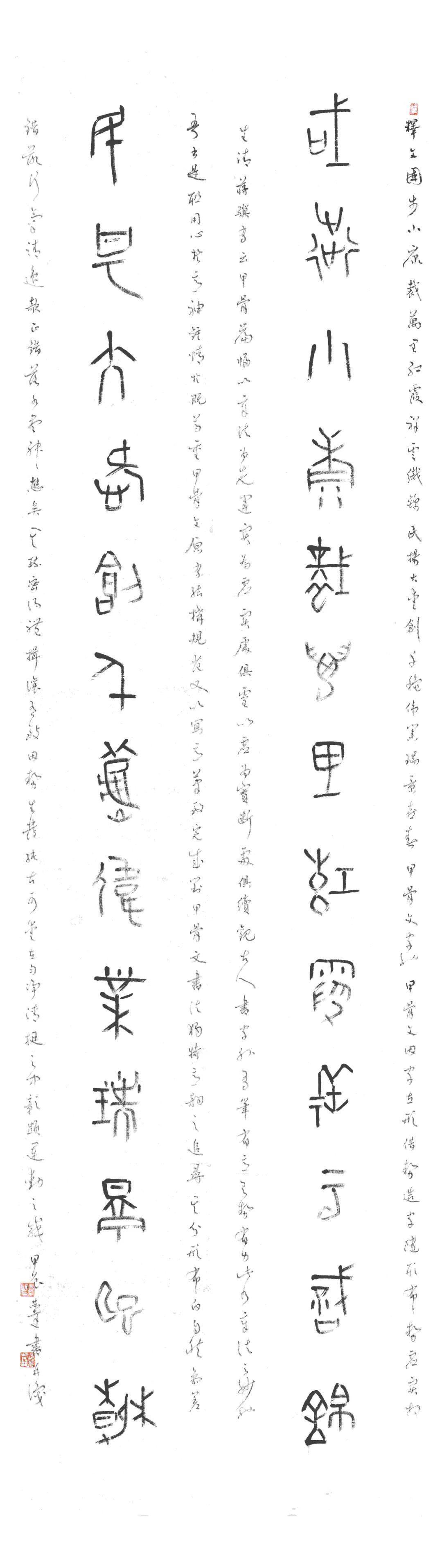 此次展览中言恭达的九体自撰楹联:“象外乾坤还太古,世间粉黛任争妍”“岂惟识度知兴废,更有劬劳克始终。”……直至小篆《心经》,也许作者此时是一种精神的自由,作者的理解跟我们的理解有一种不一样的差别,但是它毕竟是一种心境,也许“此中有真义,欲辨已忘言。”展览中十分引人注目的还有楹联边款的精彩,如:甲骨文自撰联:“国步小康裁万里红霞祥云织锦,民扬大爱创千秋伟业瑞景喜春。”其边款注释云:“此甲骨文字也。甲骨文因字立形,借势造字,随形布势,虚实相生。清蒋骥有云,甲骨篇幅以章法为先,运实为虚,实处俱灵,以虚为实,断处俱续,观古人书,字外有笔、有意、有势、有力,此乃章法之妙也。吾书是联,用心于意神,钟情于既尊重甲骨文原有结构规范,又以写意笔致完成对甲骨文书法独特意韵之追寻,其分形布白自然、参差错落、行气清逸、欹正错落,各尽神态矣。疏密得体、揖让有致、因势生发、纯古可爱,在匀净清挺中彰显运动之感。”这是作者对传统甲骨文艺术创作的独特认知,其书学思想与审美理念,笔墨创新已跃然纸上。
