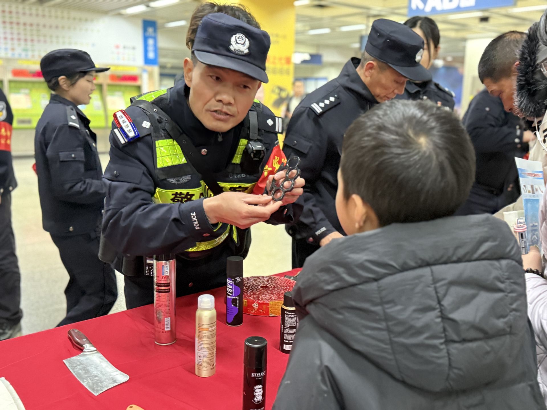 活动现场,民警还设置了违禁品展台。民警易英明向市民群众展示了地铁常见的违禁品,其中包括管制刀具、酒精、防晒喷雾等。