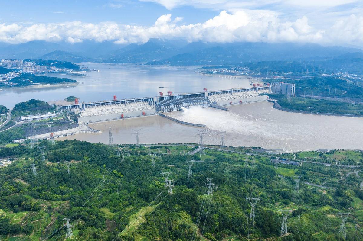 俯瞰蓝天白云下的三峡大坝及输电设施。(视界网 郑家裕 摄)