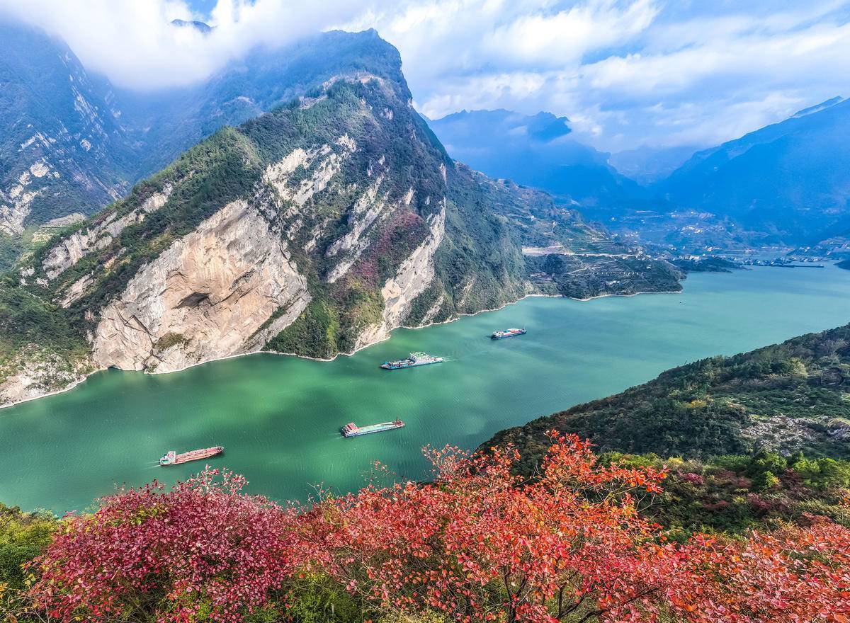 红叶映衬下的长江三峡西陵峡秭归县水域景色迤逦。(视界网 郑家裕 摄)