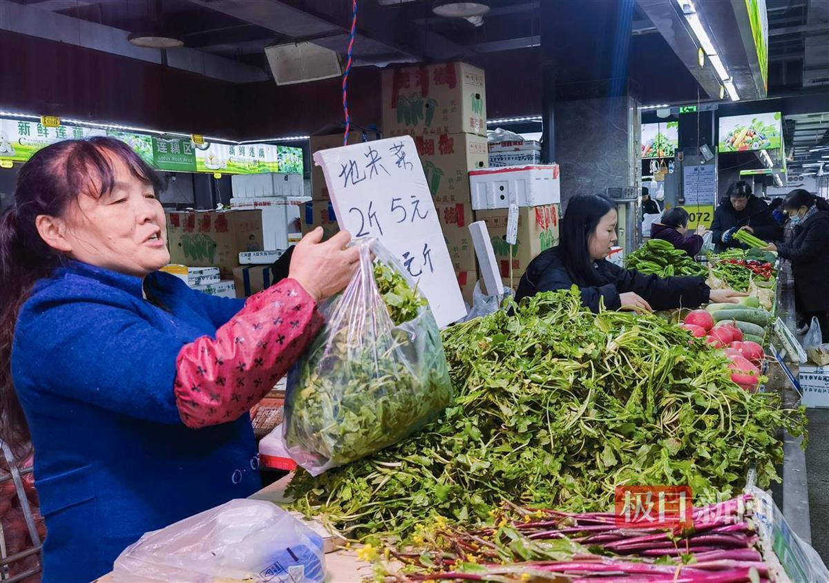 记者走访市场发现,与2月中下旬时的香椿芽、鱼腥草等时令野菜相继上市的景象相比,一场寒潮过后,江城生鲜市场上有马齿苋、田七、荠菜等更多的春鲜蔬菜冒出了头,在新出现的阳光下争鲜斗彩,而市民则成为最受益的对象,能够以更高性价比享受更多春天的时令美味。