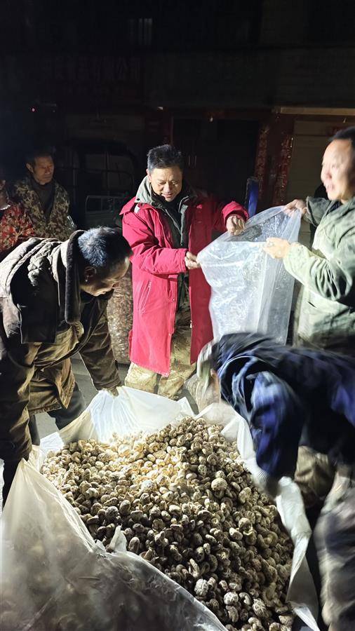 “倒出来看看。”陈金强蹲在地上把塑料布铺开,大半袋香菇随即倾倒而出。