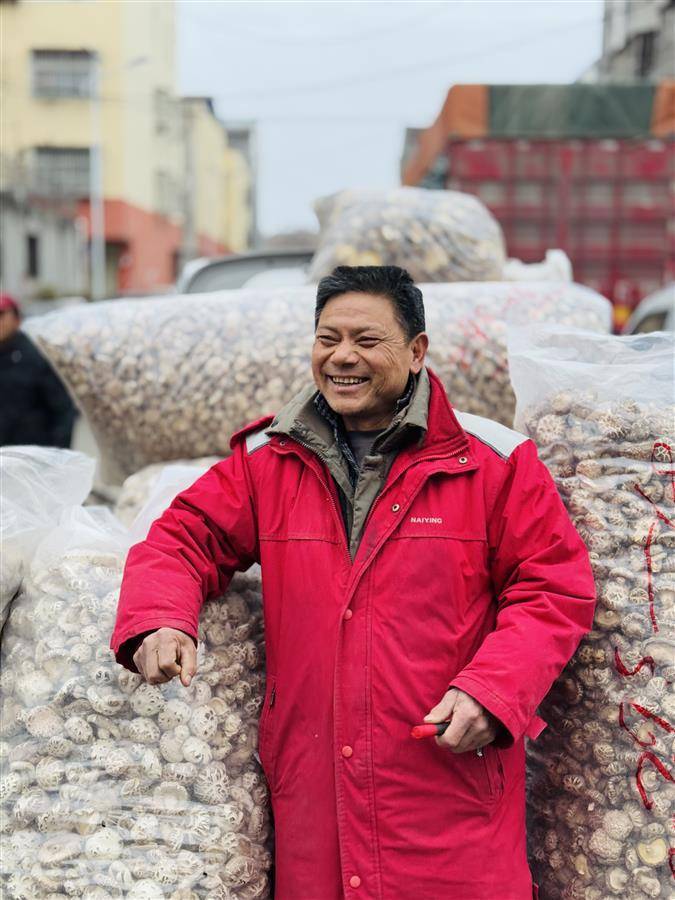 电子秤显示屏亮起,一袋袋香菇被抬上秤台,数字跳动几下,他一边大声报出重量,一边在本子上做好记录。