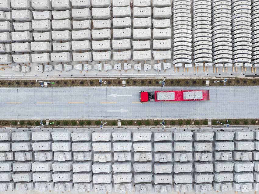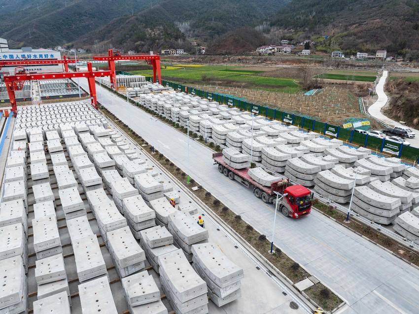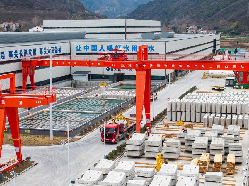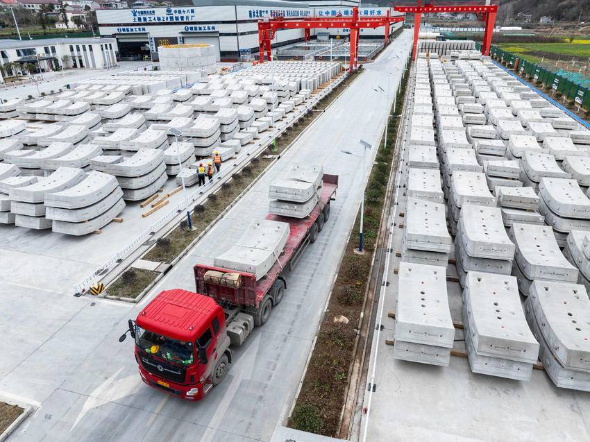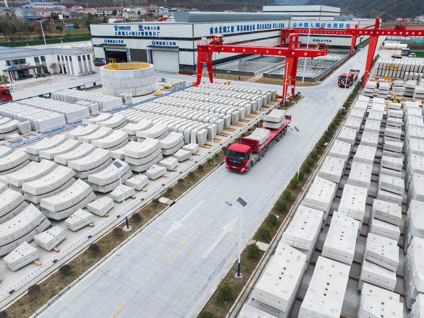 3月5日,在位于保康县马良镇的引江补汉工程土建施工及金结机电安装4标2号预制管片厂,车辆在运输预制管片,准备发往引江补汉工程建设一线。