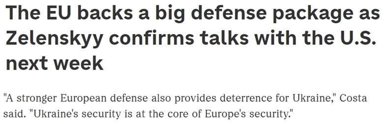 欧洲理事会主席科斯塔表示,更强大的欧洲防务也为乌克兰提供了威慑力量,而“乌克兰的安全是欧洲安全的核心所在”。