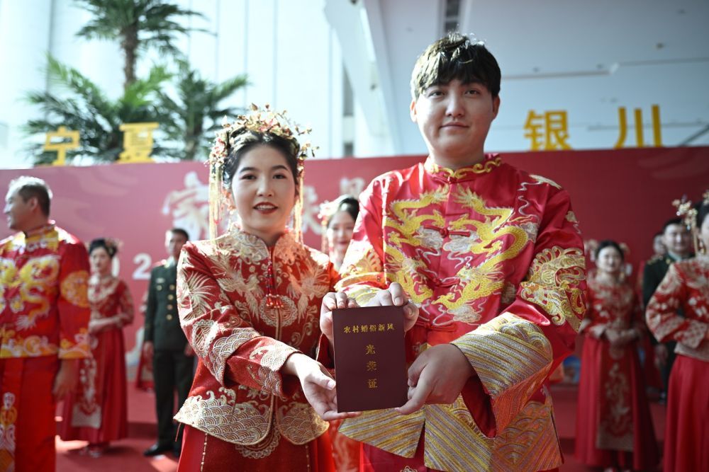 2024年9月22日,在宁夏银川市,新人在“家国同庆 见证幸福”2024年全国万人集体婚礼宁夏分会场展示“农村婚俗新风光荣证”。 新华社记者 王鹏 摄