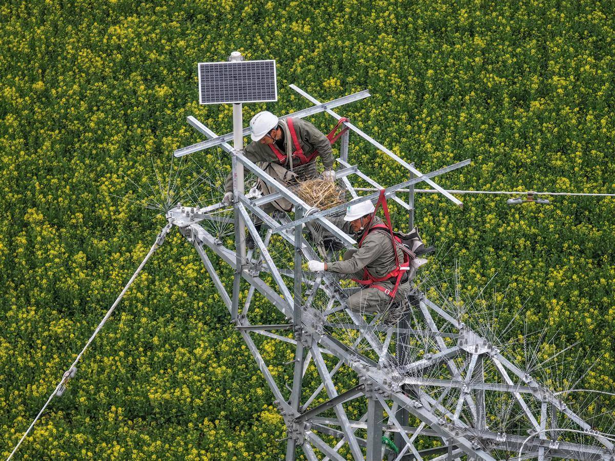 3月8日,国网荆门供电公司组织人员在汉江流域附近的110千伏碾肖线部分杆塔上安装栖鸟架、搭建人工鸟巢,为鸟类提供安全的栖息环境。