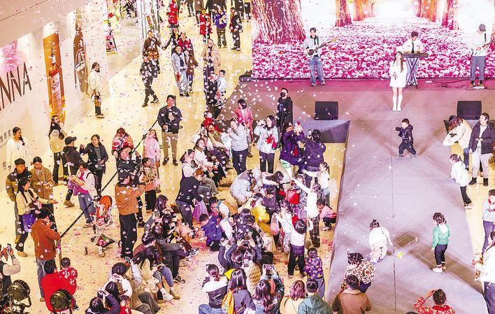 3月8日晚,武汉亲橙万象汇打造沉浸式樱花场景,定时飘落“樱花雪”,举办国风歌舞表演等,吸引市民和游客打卡购物。 (湖北日报全媒记者 薛婷 摄)