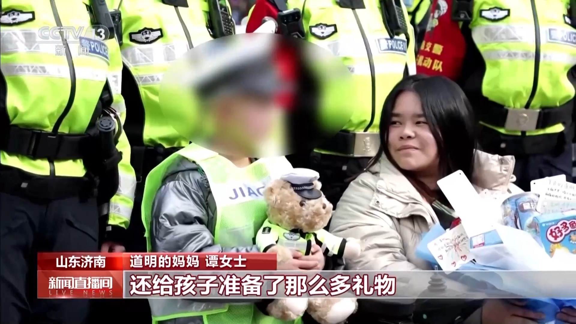 道明的妈妈 谭女士:能被这么多的交警重视,还给孩子准备了这么多礼物,济南真的很温暖,济南交警,我谢谢他们!