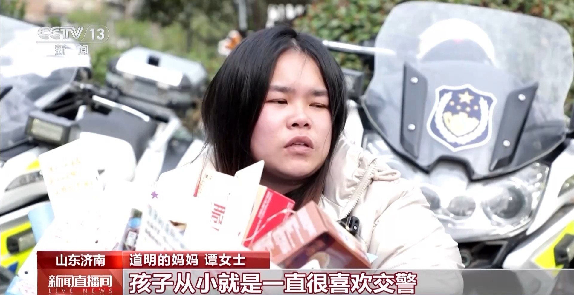 道明的妈妈 谭女士:孩子从小就是一直很喜欢交警,他也给我说过,妈妈,我的梦想就是想骑一下交警的大摩托,我想指挥一下交通。