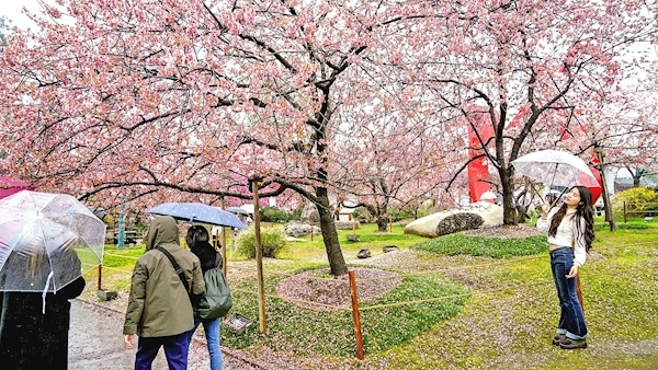 游客雨中赏樱 摄影:楚天都市报极目新闻记者李辉