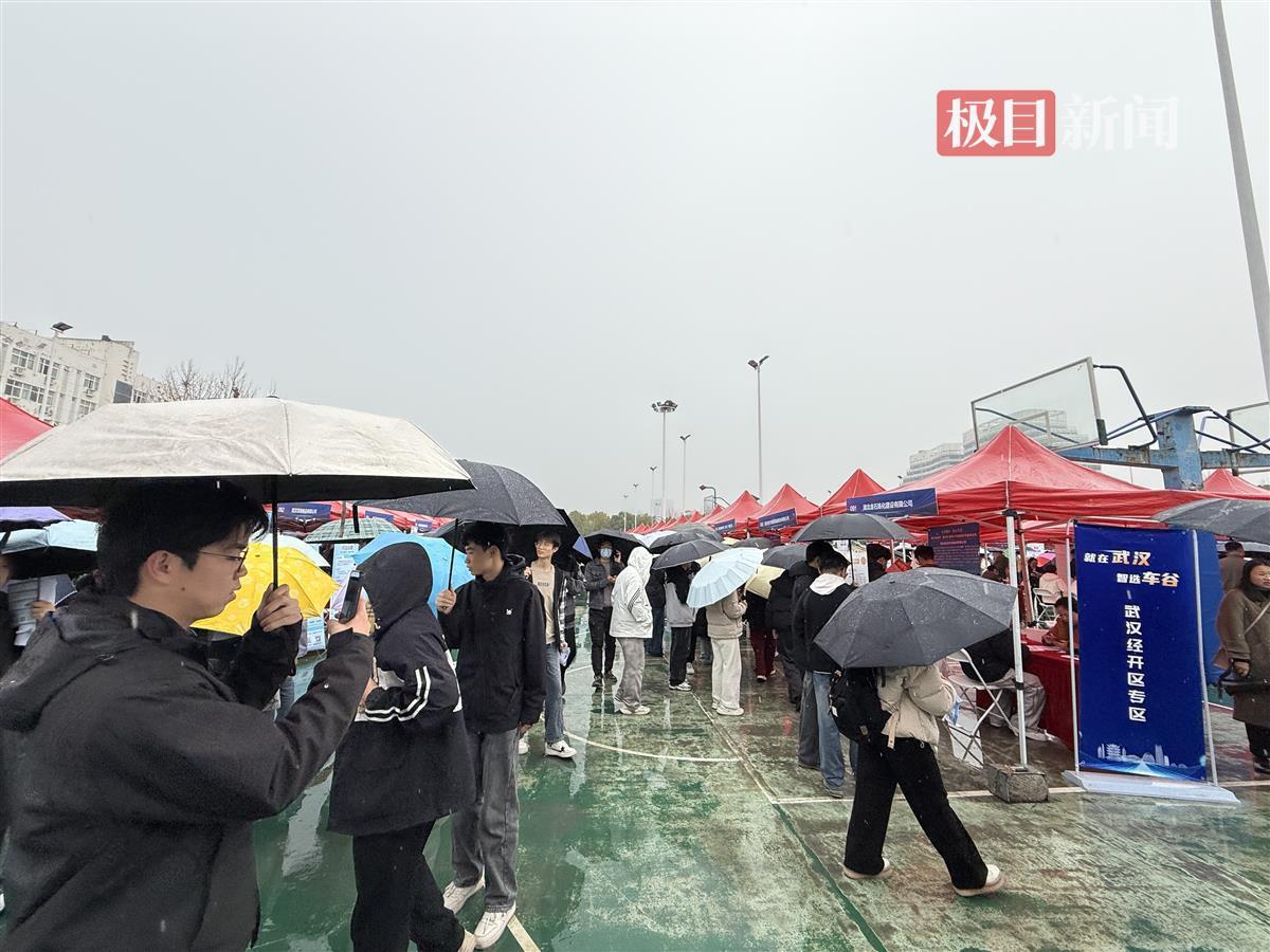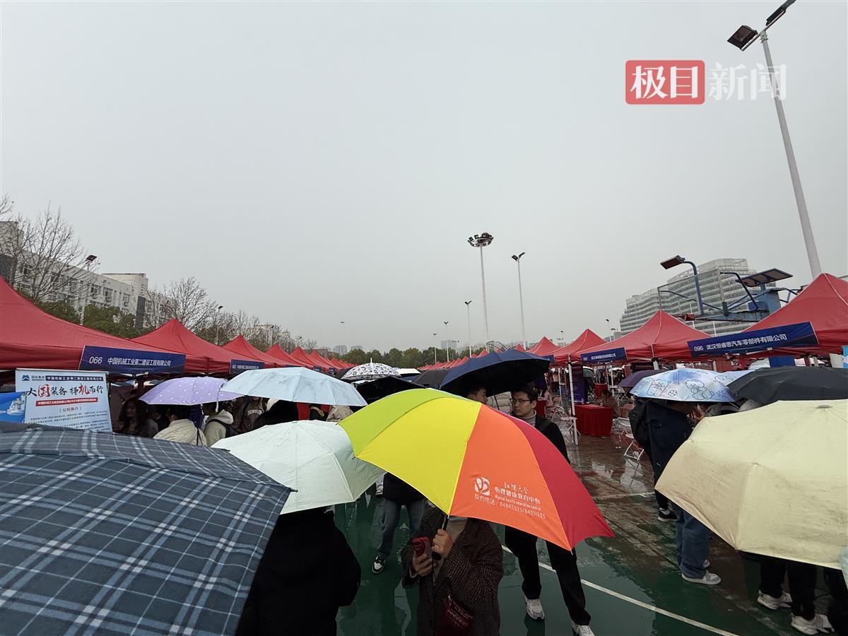3月13日下午2时许,极目新闻记者在江汉大学南区篮球场看到,不少学生冒雨带着简历前来求职,学生们撑起雨伞有序排队在企业招聘展位前排队咨询求职。